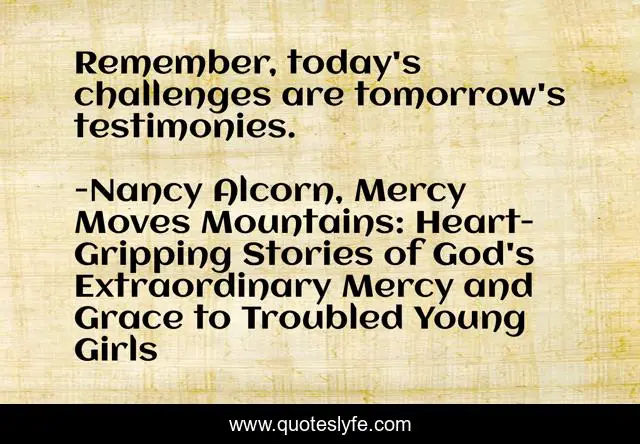 "Nancy Alcorn, Mercy Moves Mountains: Heart-Gripping Stories of God's Extraordinary Mercy and Grace to Troubled Young Girls Quotes." Quoteslyfe.com, 2025. Mon. 08 Dec. 2025. <https://www.quoteslyfe.com/quote/Remember-today-s-challenges-are-tomorrow-s-216073>.
