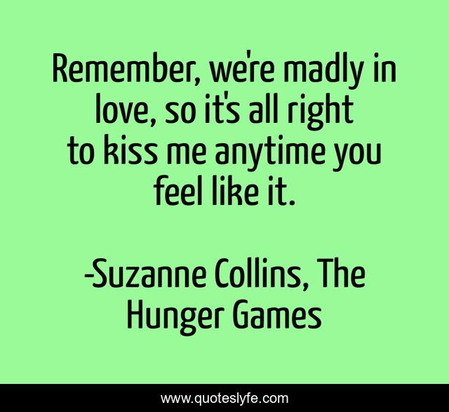 This page presents the quote "Remember, we're madly in love, so it's all right to kiss me anytime you feel like it.". Author of this quote is Suzanne Collins, The Hunger Games. .