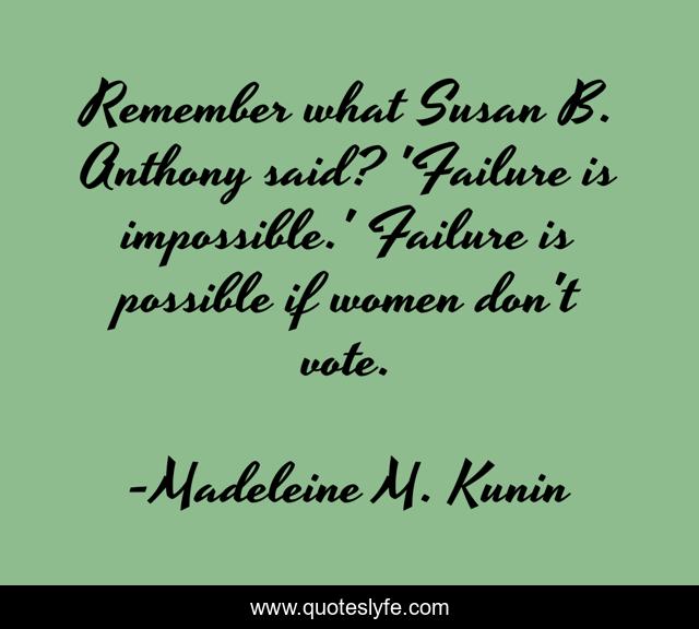 This page presents the quote "Remember what Susan B. Anthony said? 'Failure is impossible.' Failure is possible if women don't vote.". Author of this quote is Madeleine M. Kunin. This quote is about impossible, remember, women,.