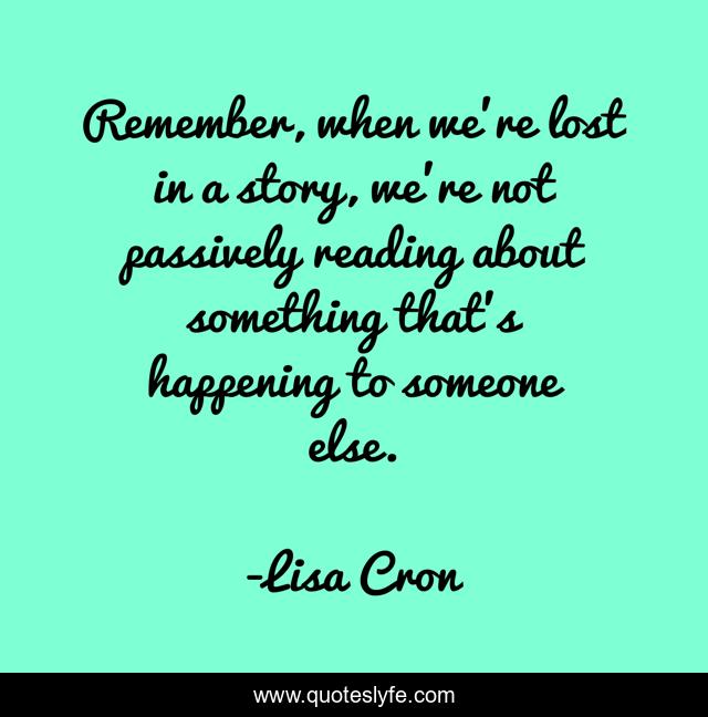 This page presents the quote "Remember, when we're lost in a story, we're not passively reading about something that's happening to someone else.". Author of this quote is Lisa Cron. This quote is about storytelling, story-genius, reading, protagonist, writing,.