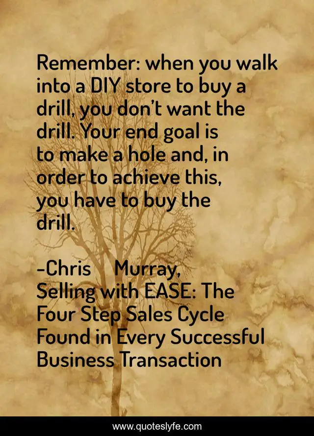 This page presents the quote "Remember: when you walk into a DIY store to buy a drill, you don’t want the drill. Your end goal is to make a hole and, in order to achieve this, you have to buy the drill.". Author of this quote is Chris Murray, Selling with EASE: The Four Step Sales Cycle Found in Every Successful Business Transaction. This quote is about negotiation, sales-effectiveness, business-advice, sales-training, money, influence, sales, trust, selling-skills,.