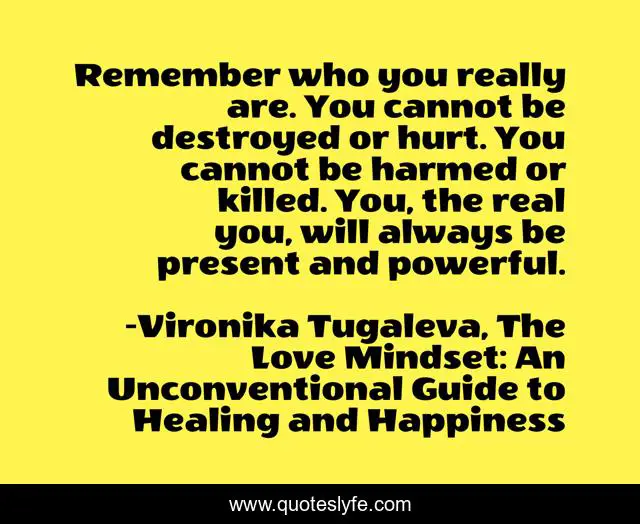 This page presents the quote "Remember who you really are. You cannot be destroyed or hurt. You cannot be harmed or killed. You, the real you, will always be present and powerful.". Author of this quote is Vironika Tugaleva, The Love Mindset: An Unconventional Guide to Healing and Happiness. This quote is about spiritual, pain, power, soul, wisdom, spirituality, true-self, truth, who-you-are,.
