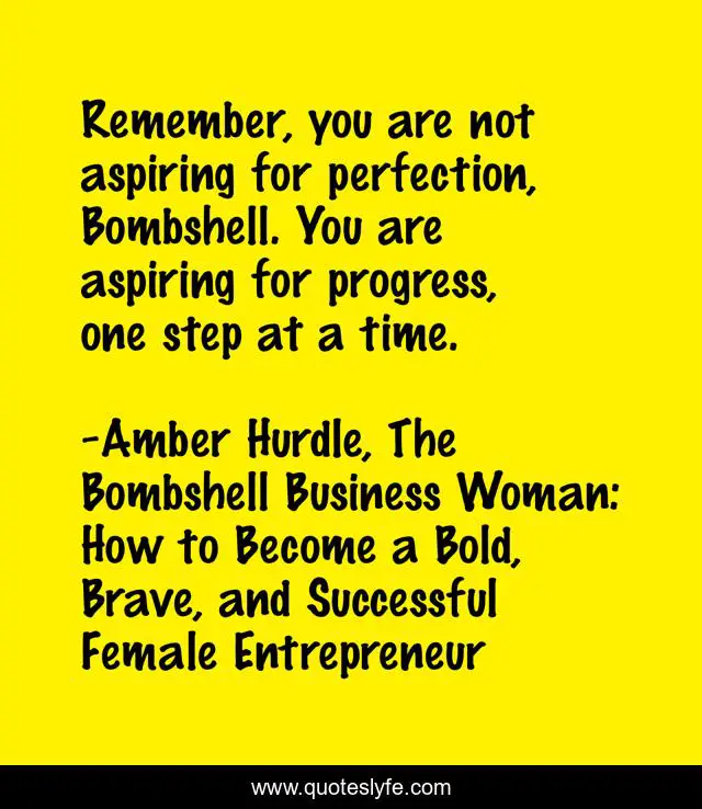 This page presents the quote "Remember, you are not aspiring for perfection, Bombshell. You are aspiring for progress, one step at a time.". Author of this quote is Amber Hurdle, The Bombshell Business Woman: How to Become a Bold, Brave, and Successful Female Entrepreneur. This quote is about womens-inspirational, individuality, business-advice, business, success, personal-growth, life, women-empowerment, womens-strength,.