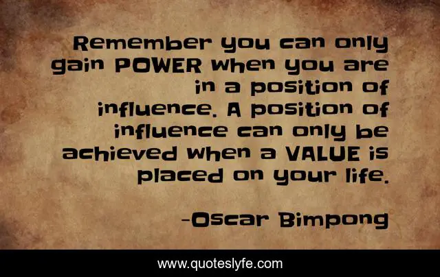 This page presents the quote "Remember you can only gain POWER when you are in a position of influence. A position of influence can only be achieved when a VALUE is placed on your life.". Author of this quote is Oscar Bimpong. This quote is about position-of-influence, values-in-life, influencing-people, power,.