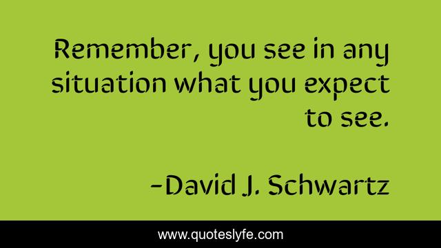 This page presents the quote "Remember, you see in any situation what you expect to see.". Author of this quote is David J. Schwartz. This quote is about conquering-defeat, optimism, perspective,.