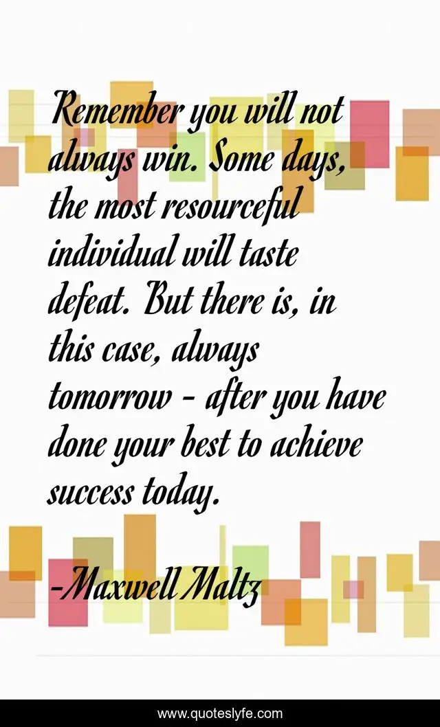 This page presents the quote "Remember you will not always win. Some days, the most resourceful individual will taste defeat. But there is, in this case, always tomorrow - after you have done your best to achieve success today.". Author of this quote is Maxwell Maltz. This quote is about best, today, tomorrow,.