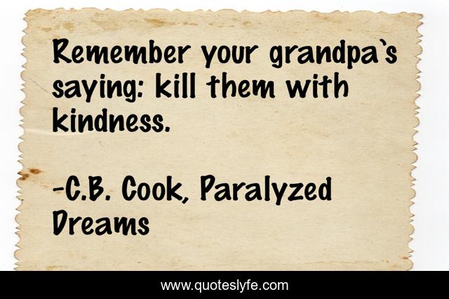 This page presents the quote "Remember your grandpa’s saying: kill them with kindness.". Author of this quote is C.B. Cook, Paralyzed Dreams. This quote is about enthusiasm, quotes-and-saying, kindness, inspirational, killing,.