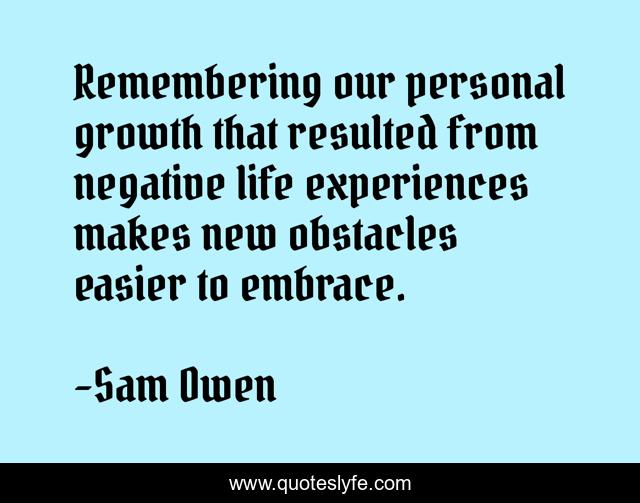 This page presents the quote "Remembering our personal growth that resulted from negative life experiences makes new obstacles easier to embrace.". Author of this quote is Sam Owen. This quote is about relationships, confidence, psychology, personal-growth, obstacles, life-experiences, negative-experiences, self-esteem,.