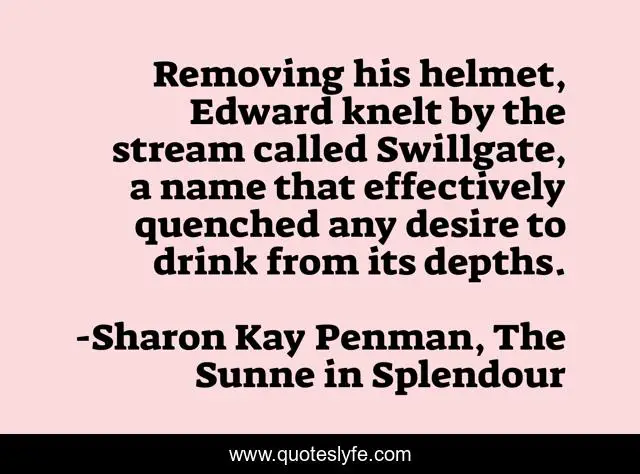 This page presents the quote "Removing his helmet, Edward knelt by the stream called Swillgate, a name that effectively quenched any desire to drink from its depths.". Author of this quote is Sharon Kay Penman, The Sunne in Splendour. .