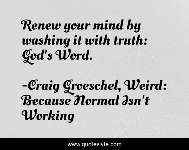 This page presents the quote "Renew your mind by washing it with truth: God's Word.". Author of this quote is Craig Groeschel, Weird: Because Normal Isn't Working. This quote is about by, bible, washing, scripture, mind, it, god-s, renew, truth,.