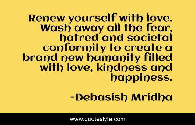 This page presents the quote "Renew yourself with love. Wash away all the fear, hatred and societal conformity to create a brand new humanity filled with love, kindness and happiness.". Author of this quote is Debasish Mridha. This quote is about debasish, mridha, philosophy, debasish-mridha, societal-conformity, renew-yourself, wash-away-fear, hatred, kindness,.