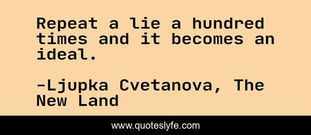 This page presents the quote "Repeat a lie a hundred times and it becomes an ideal.". Author of this quote is Ljupka Cvetanova, The New Land. This quote is about lie, aphorism, lying-to-ourselves, lying-games, telling-the-truth, becomes, a-lie, ideal-word, repeat,.