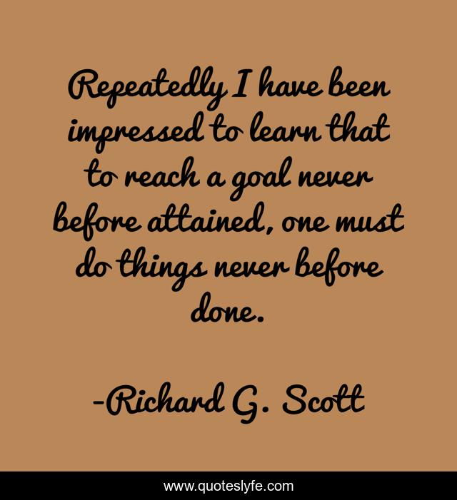 This page presents the quote "Repeatedly I have been impressed to learn that to reach a goal never before attained, one must do things never before done.". Author of this quote is Richard G. Scott. .