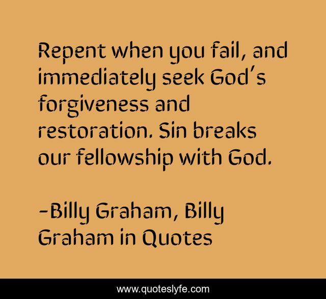 This page presents the quote "Repent when you fail, and immediately seek God’s forgiveness and restoration. Sin breaks our fellowship with God.". Author of this quote is Billy Graham, Billy Graham in Quotes. This quote is about forgiveness, billy-graham,.