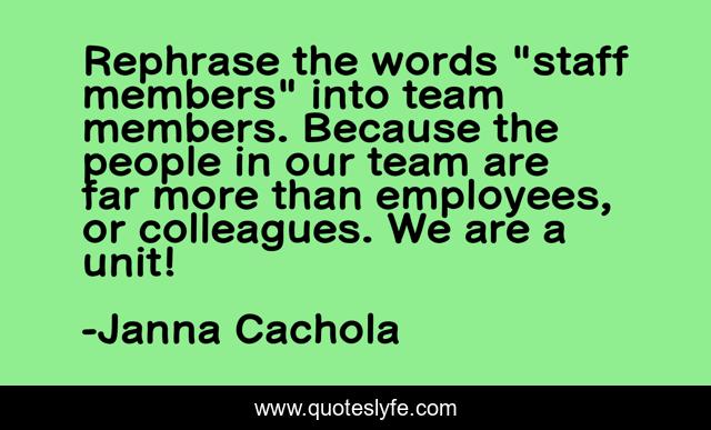 This page presents the quote "Rephrase the words "staff members" into team members. Because the people in our team are far more than employees, or colleagues. We are a unit!". Author of this quote is Janna Cachola. This quote is about team-members, courage, lead, motivate, morale, leadership, comraderie, team, teambuilder,.