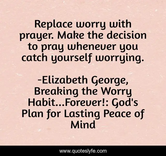 "Elizabeth George, Breaking the Worry Habit...Forever!: God's Plan for Lasting Peace of Mind Quotes." Quoteslyfe.com, 2025. Fri. 05 Dec. 2025. <https://www.quoteslyfe.com/quote/Replace-worry-with-prayer-Make-the-decision-115299>.