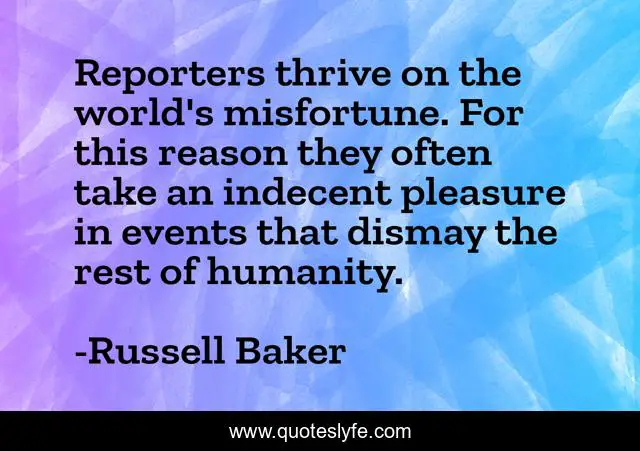This page presents the quote "Reporters thrive on the world's misfortune. For this reason they often take an indecent pleasure in events that dismay the rest of humanity.". Author of this quote is Russell Baker. This quote is about world, humanity, rest,.