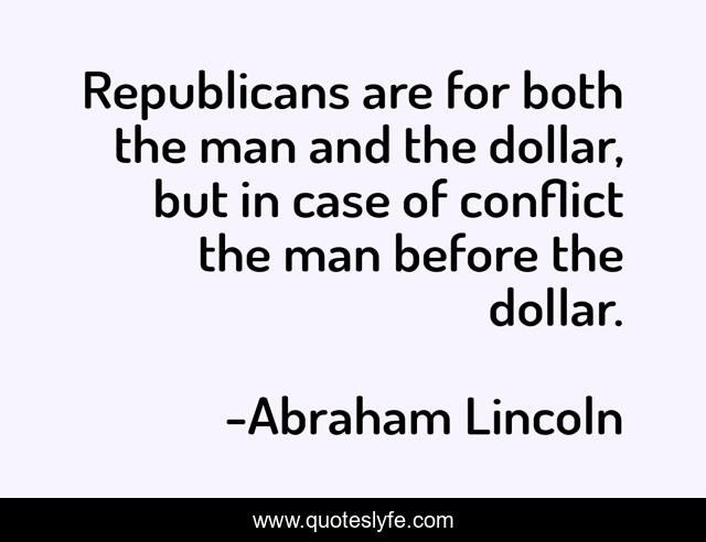 This page presents the quote "Republicans are for both the man and the dollar, but in case of conflict the man before the dollar.". Author of this quote is Abraham Lincoln. This quote is about politics, political-parties, enthusiasm, inspirational, religion,.