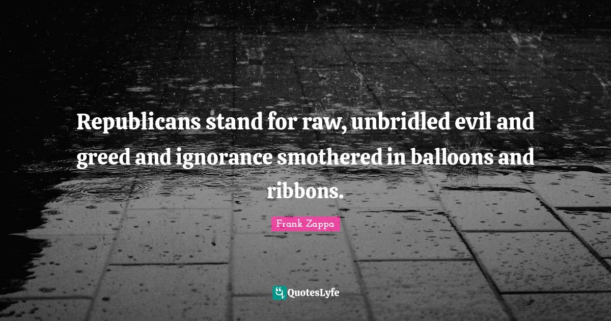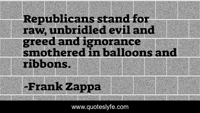 This page presents the quote "Republicans stand for raw, unbridled evil and greed and ignorance smothered in balloons and ribbons.". Author of this quote is Frank Zappa. This quote is about politics, republicans,.