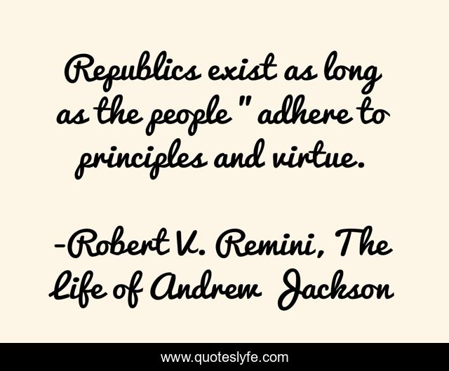 This page presents the quote "Republics exist as long as the people "adhere to principles and virtue.". Author of this quote is Robert V. Remini, The Life of Andrew Jackson. This quote is about politics, democracy, morality,.