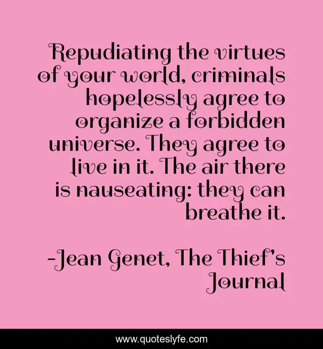 "Jean Genet, The Thief's Journal Quotes." Quoteslyfe.com, 2025. Sat. 06 Dec. 2025. <https://www.quoteslyfe.com/quote/Repudiating-the-virtues-of-your-world-criminals-251181>.