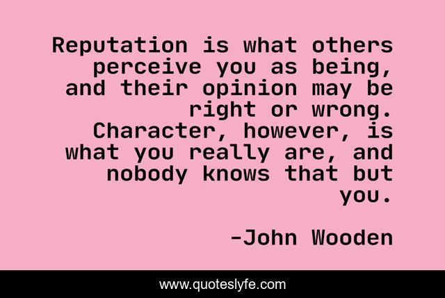 This page presents the quote "Reputation is what others perceive you as being, and their opinion may be right or wrong. Character, however, is what you really are, and nobody knows that but you.". Author of this quote is John Wooden. This quote is about leadership, character, reputation,.