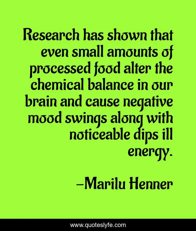 This page presents the quote "Research has shown that even small amounts of processed food alter the chemical balance in our brain and cause negative mood swings along with noticeable dips ill energy.". Author of this quote is Marilu Henner. This quote is about brain, balance, research,.