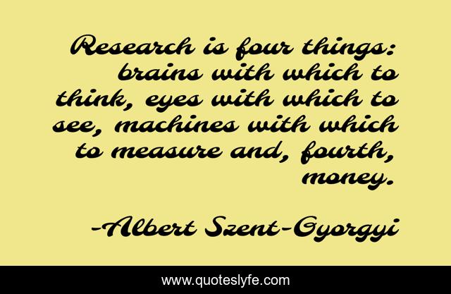 This page presents the quote "Research is four things: brains with which to think, eyes with which to see, machines with which to measure and, fourth, money.". Author of this quote is Albert Szent-Gyorgyi. This quote is about eyes, think, research,.