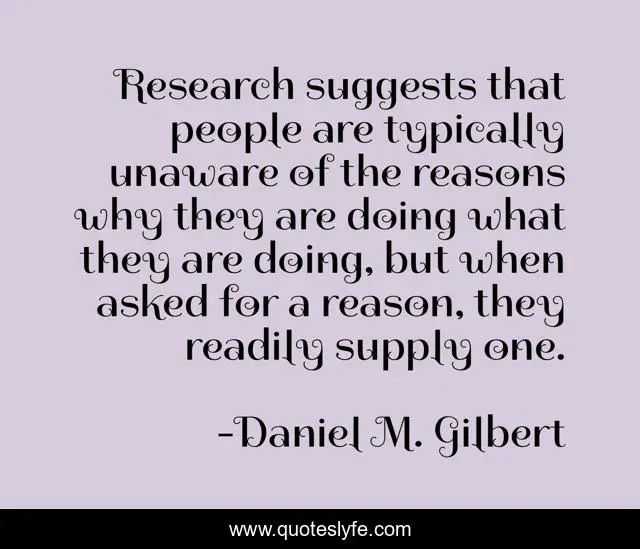 This page presents the quote "Research suggests that people are typically unaware of the reasons why they are doing what they are doing, but when asked for a reason, they readily supply one.". Author of this quote is Daniel M. Gilbert. This quote is about making-excuses, awareness, justifications,.