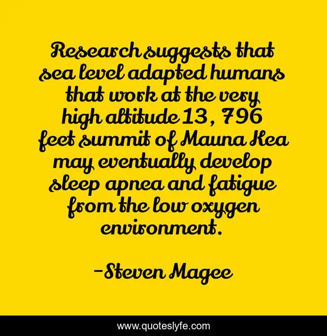This page presents the quote "Research suggests that sea level adapted humans that work at the very high altitude 13, 796 feet summit of Mauna Kea may eventually develop sleep apnea and fatigue from the low oxygen environment.". Author of this quote is Steven Magee. This quote is about science, altitude, work, kea, research, environment, sleep, mauna, human,.