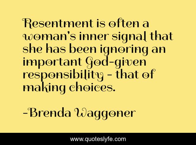 This page presents the quote "Resentment is often a woman's inner signal that she has been ignoring an important God-given responsibility - that of making choices.". Author of this quote is Brenda Waggoner. This quote is about submission, emotions, feelings, resentment, choices, identity, women,.