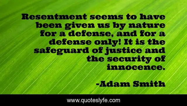 This page presents the quote "Resentment seems to have been given us by nature for a defense, and for a defense only! It is the safeguard of justice and the security of innocence.". Author of this quote is Adam Smith. This quote is about justice, security, innocence,.