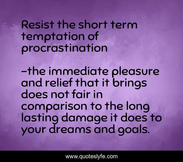 "the immediate pleasure and relief that it brings does not fair in comparison to the long lasting damage it does to your dreams and goals. Quotes." Quoteslyfe.com, 2025. Sun. 07 Dec. 2025. <https://www.quoteslyfe.com/quote/Resist-the-short-term-temptation-of-procrastination-92203>.