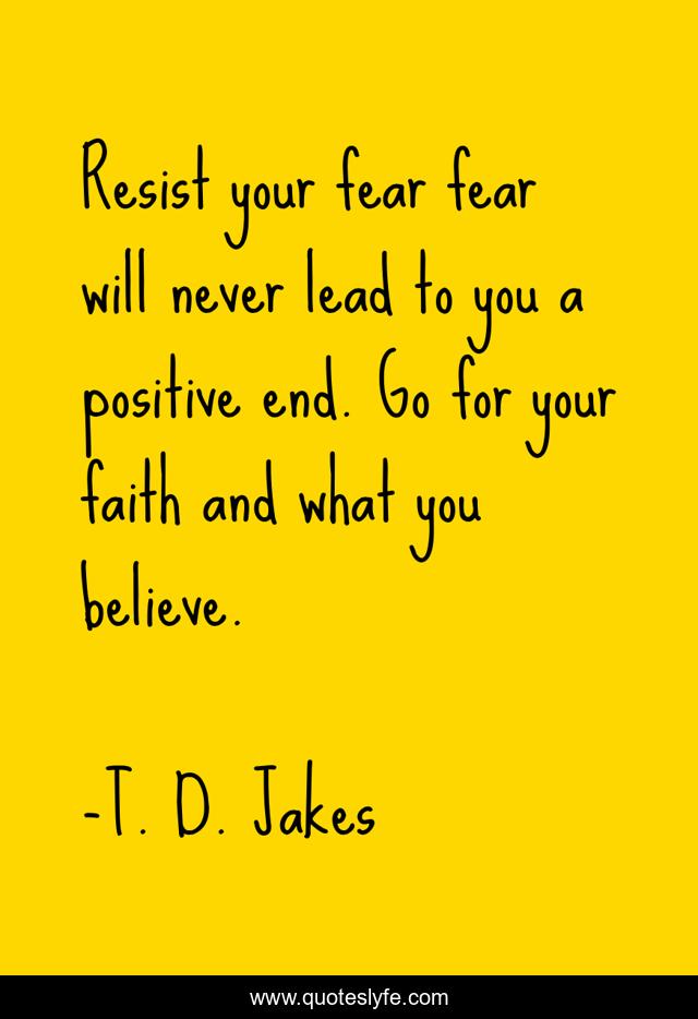 This page presents the quote "Resist your fear fear will never lead to you a positive end. Go for your faith and what you believe.". Author of this quote is T. D. Jakes. This quote is about positive, confidence, believe, faith,.