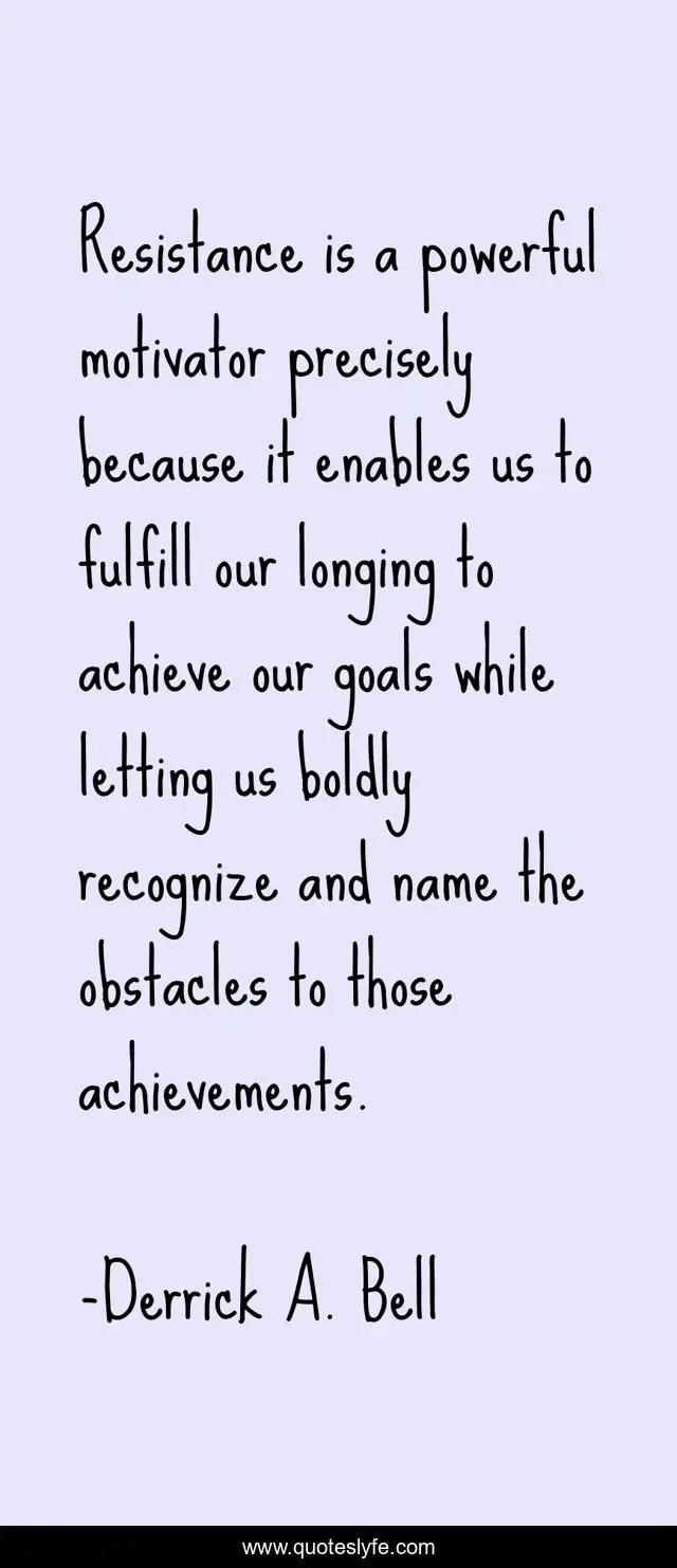 This page presents the quote "Resistance is a powerful motivator precisely because it enables us to fulfill our longing to achieve our goals while letting us boldly recognize and name the obstacles to those achievements.". Author of this quote is Derrick A. Bell. This quote is about achievements, motivation, success, obstacles, resistance, goals,.
