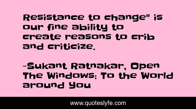 This page presents the quote "Resistance to change" is our fine ability to create reasons to crib and criticize.". Author of this quote is Sukant Ratnakar, Open The Windows: To the World around You. This quote is about resistance-to-change, behaviour, attitude, change, happiness,.
