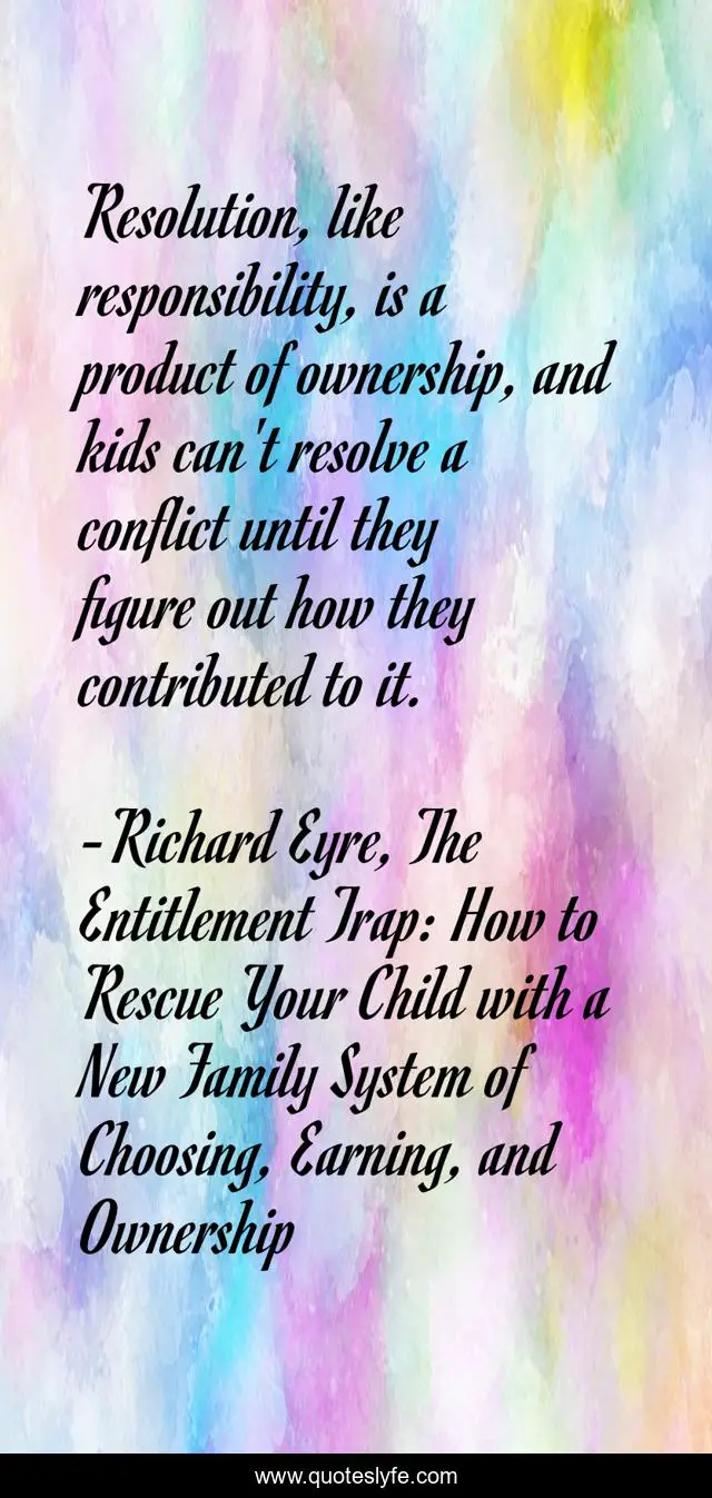 This page presents the quote "Resolution, like responsibility, is a product of ownership, and kids can't resolve a conflict until they figure out how they contributed to it.". Author of this quote is Richard Eyre, The Entitlement Trap: How to Rescue Your Child with a New Family System of Choosing, Earning, and Ownership. This quote is about kids, entitlement, peace, parenting, responsibility, ownership, resolution, children, conflict,.