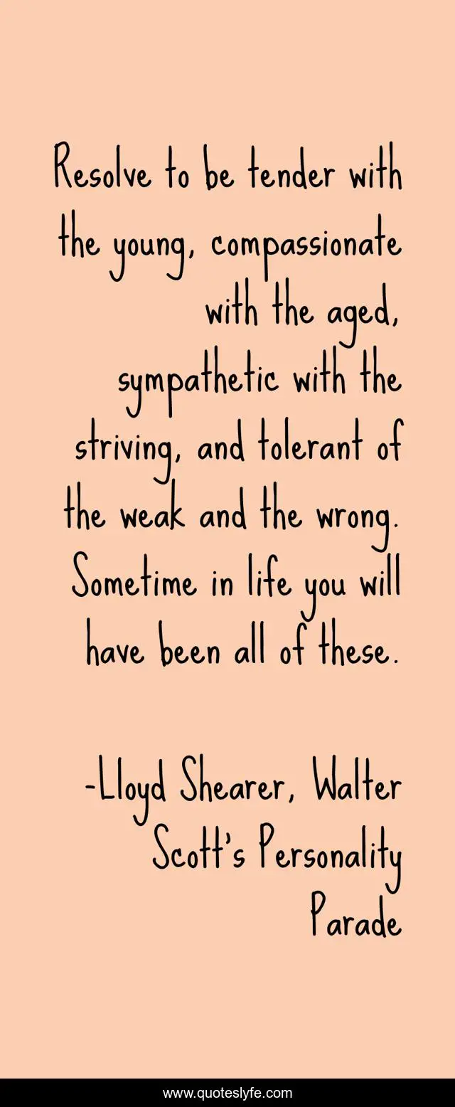 This page presents the quote "Resolve to be tender with the young, compassionate with the aged, sympathetic with the striving, and tolerant of the weak and the wrong. Sometime in life you will have been all of these.". Author of this quote is Lloyd Shearer, Walter Scott's Personality Parade. This quote is about misattributed-buddha, empathy, tolerance, understanding,.