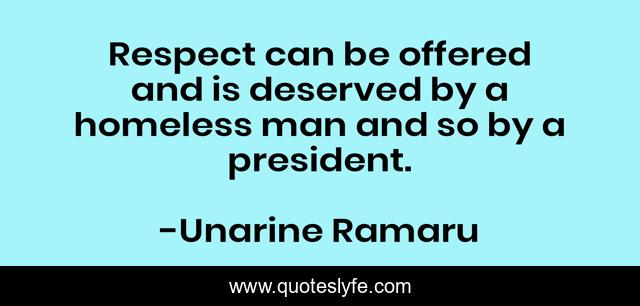 This page presents the quote "Respect can be offered and is deserved by a homeless man and so by a president.". Author of this quote is Unarine Ramaru. This quote is about people-skills, society, humanity, respect,.