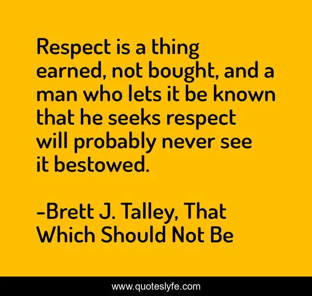 This page presents the quote "Respect is a thing earned, not bought, and a man who lets it be known that he seeks respect will probably never see it bestowed.". Author of this quote is Brett J. Talley, That Which Should Not Be. .
