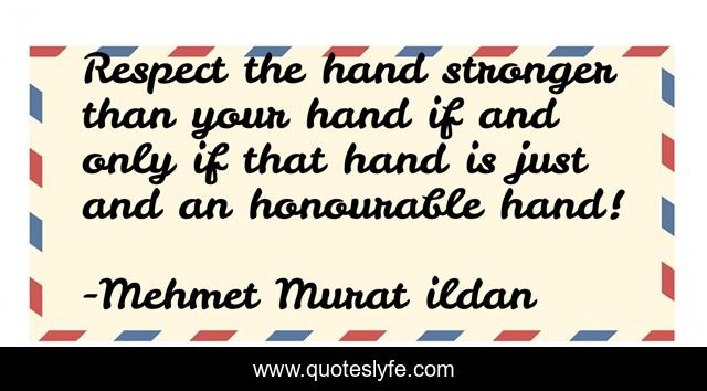 This page presents the quote "Respect the hand stronger than your hand if and only if that hand is just and an honourable hand!". Author of this quote is Mehmet Murat ildan. This quote is about turkish-aphorisms, respecting-others, just, ildan-wise-sayings, turkish, ildan-wisdom, stronger, turkish-sayings, turkish-playwrights,.