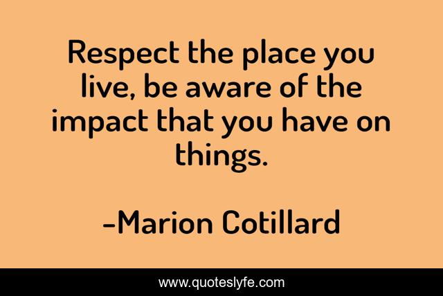 This page presents the quote "Respect the place you live, be aware of the impact that you have on things.". Author of this quote is Marion Cotillard. This quote is about impact, live,.