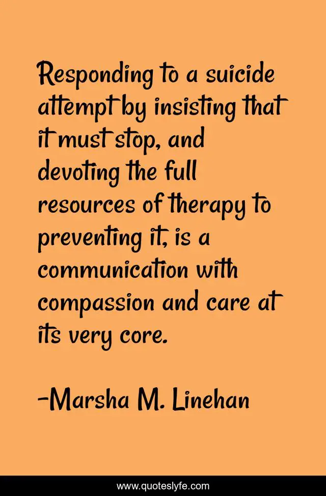 This page presents the quote "Responding to a suicide attempt by insisting that it must stop, and devoting the full resources of therapy to preventing it, is a communication with compassion and care at its very core.". Author of this quote is Marsha M. Linehan. This quote is about suicide, dbt,.