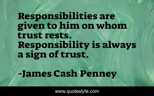 This page presents the quote "Responsibilities are given to him on whom trust rests. Responsibility is always a sign of trust.". Author of this quote is James Cash Penney. This quote is about always, responsibility, him,.