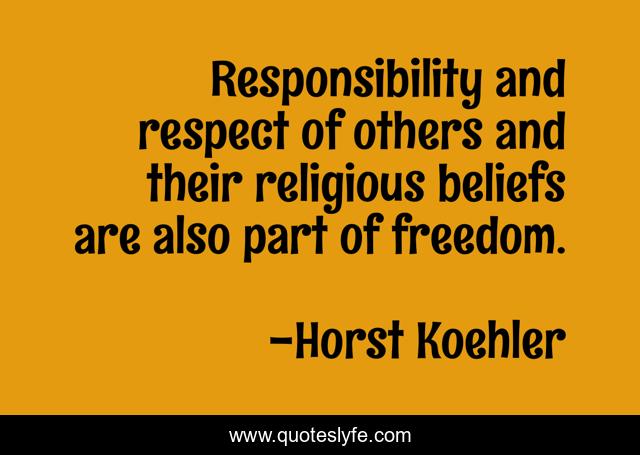 This page presents the quote "Responsibility and respect of others and their religious beliefs are also part of freedom.". Author of this quote is Horst Koehler. This quote is about freedom, responsibility,.
