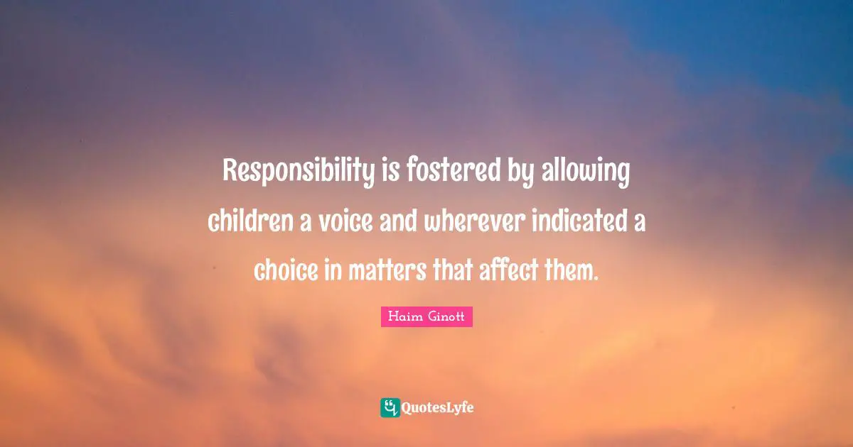 This page presents the quote "Responsibility is fostered by allowing children a voice and wherever indicated a choice in matters that affect them.". Author of this quote is Haim Ginott. This quote is about responsibility, allowing, children, voice,.