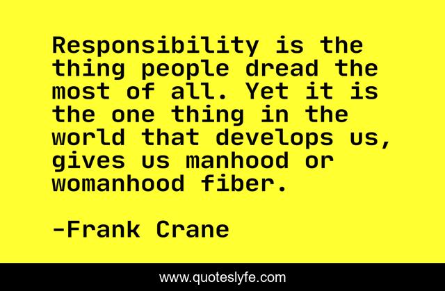 This page presents the quote "Responsibility is the thing people dread the most of all. Yet it is the one thing in the world that develops us, gives us manhood or womanhood fiber.". Author of this quote is Frank Crane. .