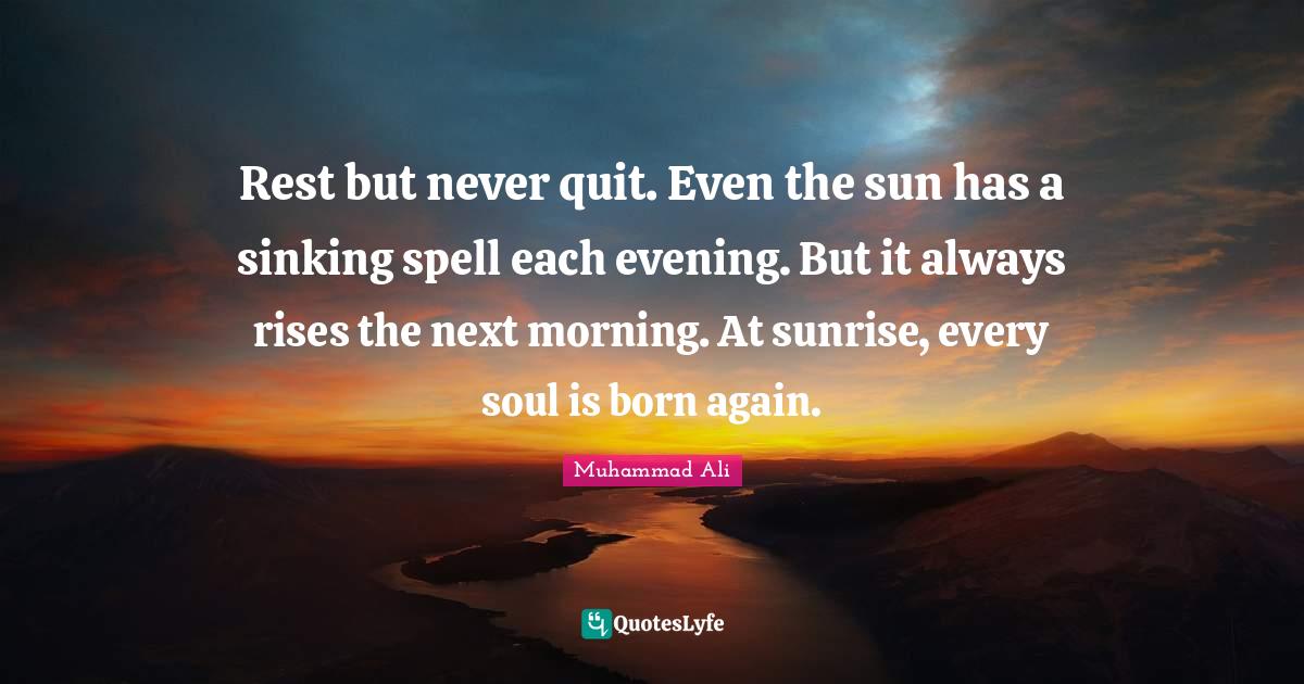 This page presents the quote "Rest but never quit. Even the sun has a sinking spell each evening. But it always rises the next morning. At sunrise, every soul is born again.". Author of this quote is Muhammad Ali. This quote is about next, soul, sunrise, sun, never quit, evening, born again, morning, sinking,.