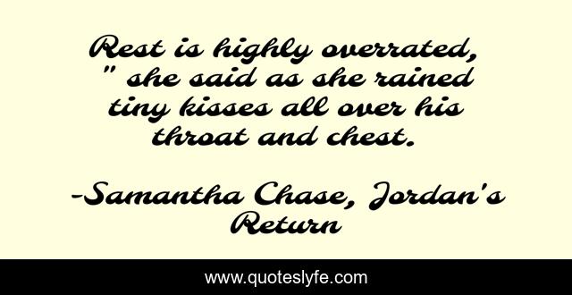 This page presents the quote "Rest is highly overrated, " she said as she rained tiny kisses all over his throat and chest.". Author of this quote is Samantha Chase, Jordan's Return. This quote is about beach-romance, contemporary-romance, second-chance-at-love,.