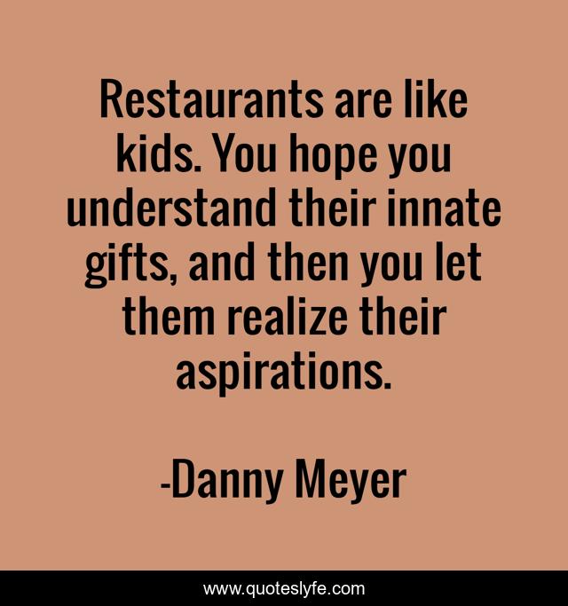 This page presents the quote "Restaurants are like kids. You hope you understand their innate gifts, and then you let them realize their aspirations.". Author of this quote is Danny Meyer. This quote is about kids, realize,.
